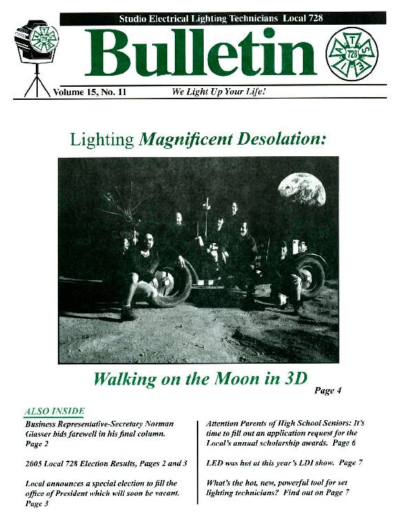 Walking on the Moon in 3D: "Magnificent Desolation" Norm Glasser's Final Column Special Local 728 Election Scholarship Info Month & Year Nov 2005 Doc Type Bulletins PDF Document 2005November_Bulletin.pdf Thumbnail
