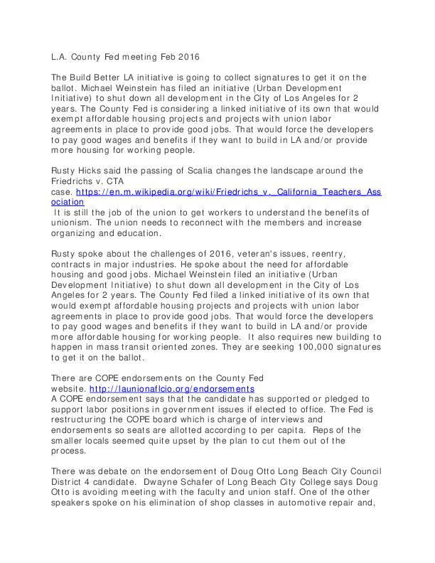 Rusty spoke about the challenges of 2016, veteran's issues, reentry, contracts in major industries. He spoke about the need for affordable housing and good jobs. Michael Weinstein filed an initiative (Urban Development Initiative) to shut down all development in the City of Los Angeles for 2 years. The County Fed filed a linked initiative of its own that would exempt affordable housing projects and projects with union labor agreements in place to provide good jobs. That would force the developers to pay good wages and benefits if they want to build in LA and/or provide more affordable housing for working people. It also requires new building to happen in mass transit oriented zones. They are seeking 100,000 signatures to get it on the ballot.
